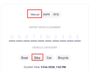 Manual entry ensures that every vehicle entering a parking location is still tracked digitally, with full visibility into timings, duration, pricing, and revenue.