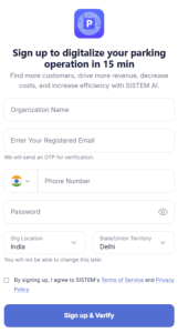 The organization represents the entity running the parking business. This could be a company, residential society, contractor, or public authority. The admin is responsible to establish the organization within SISTEM Platform with its elevated access.